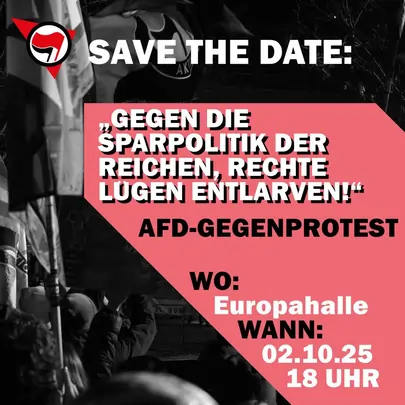 Lasst uns deshalb am 02.10. um 18 Uhr auf die Straße gehen! Gegen die verlogene Sozialpolitik der AfD und gegen die Sparmaßnahmen der Reichen!