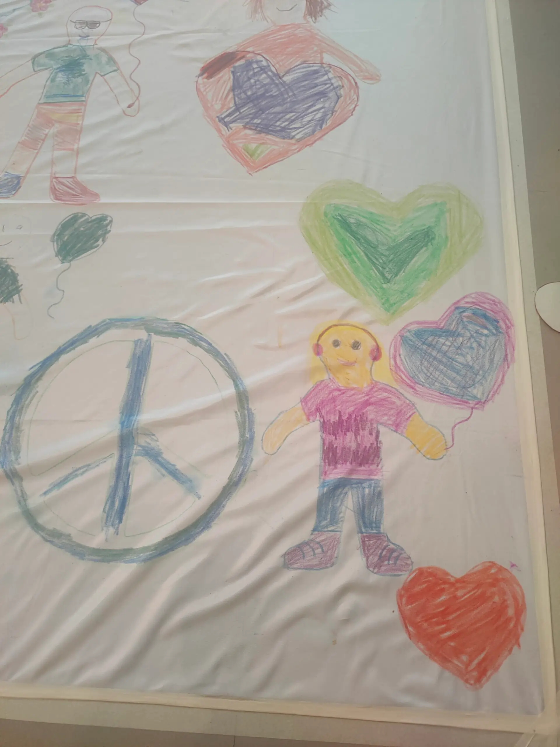 „Unsere Welt braucht mehr Liebe, Frieden und Mitgefühl…Wir malen und gestalten zusammen für Eltern, Großeltern, Tanten, Onkeln, Nachbar*innen, Freund*innen bunte Fahnen für mehr Miteinander und Menschlichkeit.“,