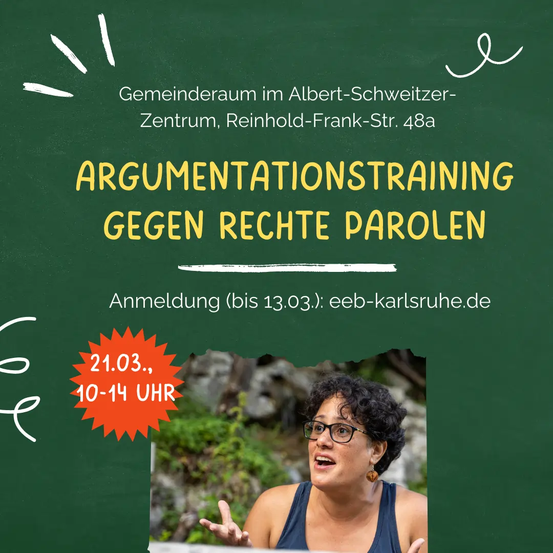 Anmeldeadresse für das Argumentationstraining am 21.3. (Anmeldeschluss: 13.03., Mail: eeb.karlsruhe@kbz.ekiba.de)