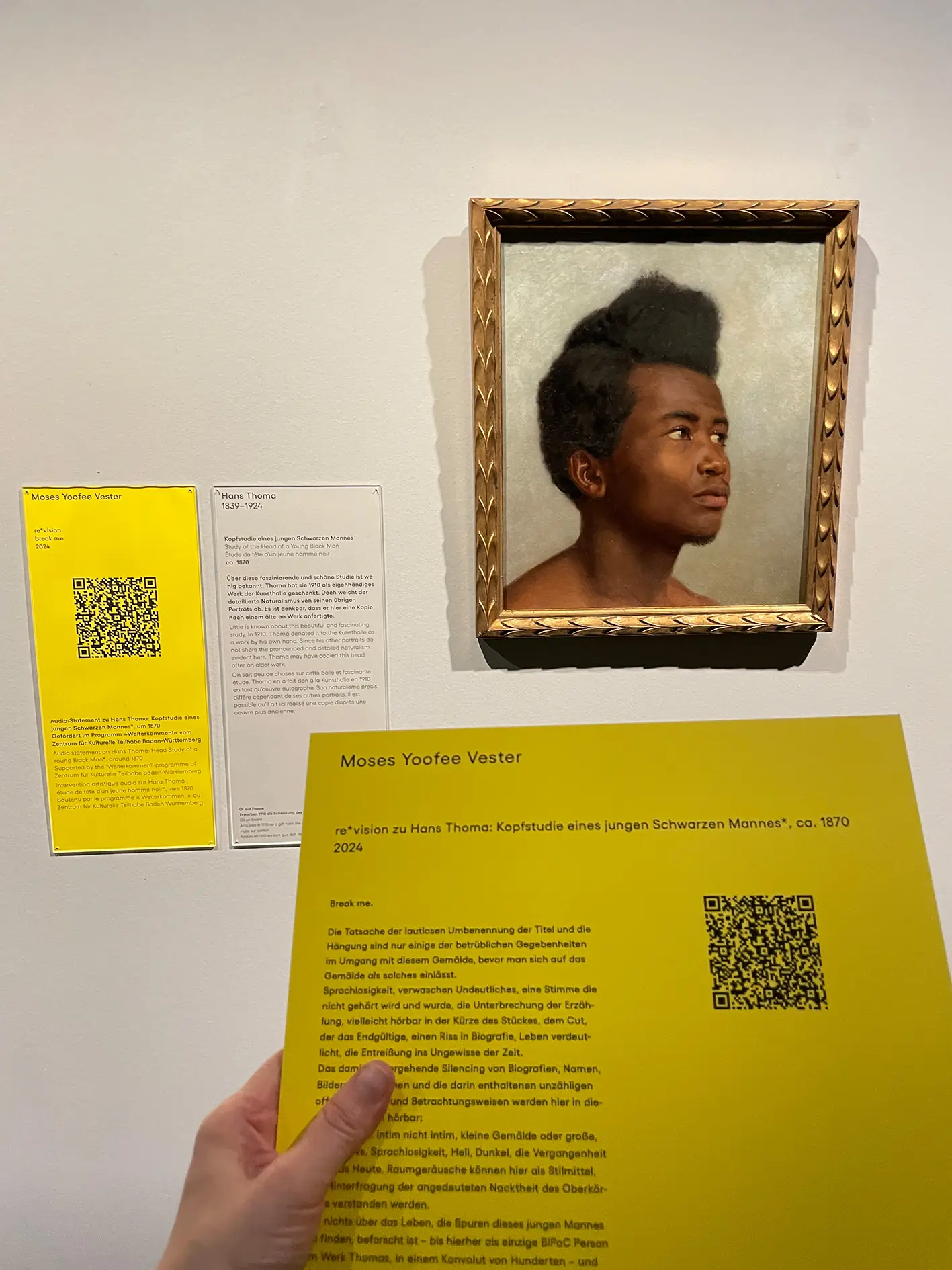 In dieser Führung werden ausgewählte Sammlungswerke der Staatlichen Kunsthalle Karlsruhe vorgestellt, die durch künstlerische Kommentare von Autor*innen ergänzt wurden, die selbst von Rassismus betroffen sind. Ihre Beiträge laden zum Nachdenken ein, eröffnen neue Zugänge und zeigen, wie kritisch-reflektierte Betrachtung unser Verständnis von Kunst und Gesellschaft erweitern kann.