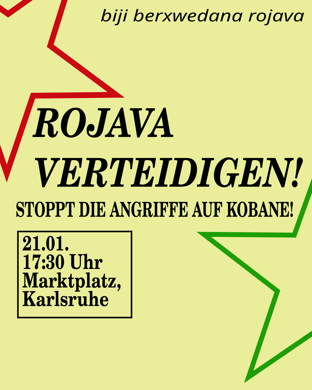 Die Angriffe der HTS auf die kurdische Selbstverwaltung spitzen sich immer weiter zu. Nun ist auch Kobane, der Stützpunkt des Widerstands gegen den IS, umzingelt und droht von dem religiös-fundamentalistischen Gruppen eingenommen zu werden. Gleichzeitig werden IS-Kämpfer aus kurdischen Gefängnissen befreit, die Bevölkerung angegriffen und kurdische Kämpfer und Kämpferinnen massakriert. Gleichzeitig baut der deutsche Staat die diplomatischen und finanziellen Beziehungen zu der syrischen Regierung aus. Der gescheiterte Waffenstillstand zwischen der SDF und der HTS hätte eine vollständige Kapitulation der kurdischen Selbstverwaltung beinhaltet. Es ist an auch uns die Errungenschaften der Revolution in Rojava, die demokratische Gemeinschaft, alternative Gesellschaftssysteme und die Frauenrevolution zu verteidigen. Von Karlsruhe bis nach Kobane – Rojava verteidigen! kommt deshalb mit uns am Mittwoch zu einer Mahnwache auf die Straße 17:30 Uhr, Marktplatz!