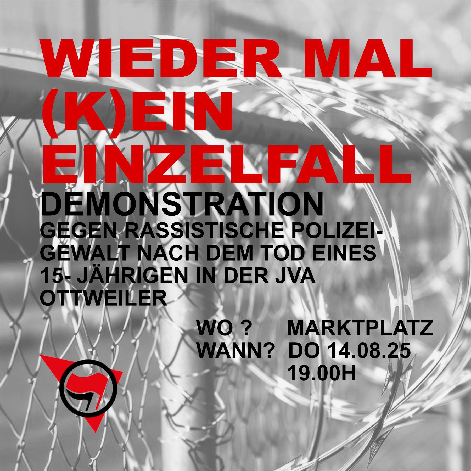 Am Donnerstag Abend um 19 Uhr veranstalten wir am Marktplatz eine Kundgebung für Nelson, den 15 jährigen Jungen der vergangene Woche in der JVA Ottweiler starb und generell zu Opfern rassistischer Polizeigewalt. Anschließend wird es eine Demo durch die Innenstadt geben.