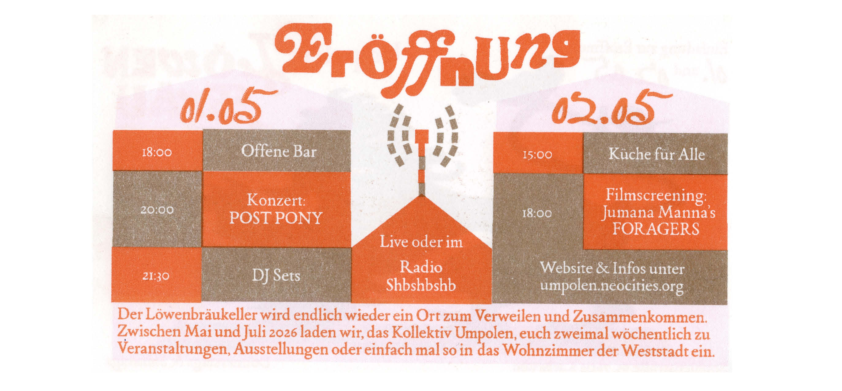 Für unser Eröffnungwochende freuen wir uns am 1. Mai, ab 18 Uhr unsere Bar zu eröffnen und dann sehr wieder Post Pony bei uns dazu haben, die ab 20 Uhr ein Konzert spielen wird! Danach wird es noch DJ Sets geben!